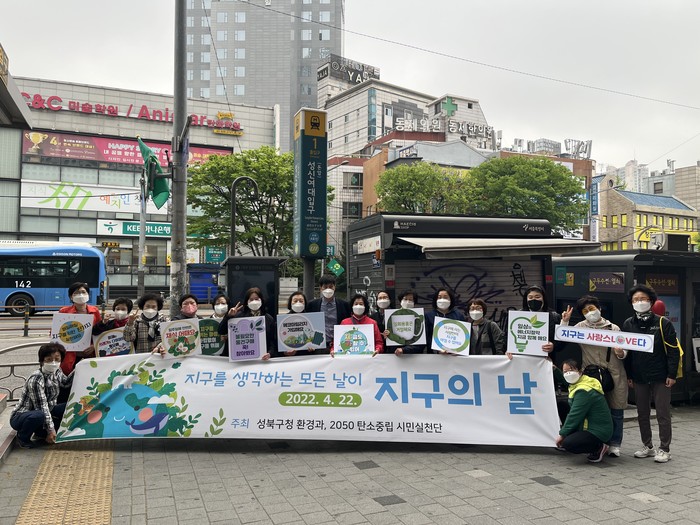 서울 성북구는 지난 22일 52주년 ‘지구의 날’을 맞이해 성신여대역과 하나로 거리, 성북구청 바람마당에서 성북구 2050 탄소중립 시민실천단과 함께 지구를 살리는 일상생활속 탄소중립 실천 방법 홍보를 위해 거리 캠페인을 실시했다. 사진은 이날 캠페인 참가자들이 기념촬영을 하는 모습. (사진제공=성북구청)