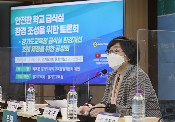 한편, 이날 토론회는 '경기도교육청 급식실 환경 개선 조례' 제정을 위한 공청회를 겸해 열렸는데, 조례안을 준비 중인 박옥분 의원은 "학교 급식실의 조리인력 배치기준은 이미 다른 공공기관 조리인력 배치기준을 2배를 넘어서 말 그대로 극한직업인 상태다. 불편한 진실을 감추려 할 것이 아니라 급식실 환경을 전문화된 외부 기관을 통해 안전하고 쾌적하게 관리하도록 하고, 근본적으로는 조리인력 배치기준을 완화하는 노력을 해야 한다"며 "조례 제정을 통해 학교의 노동자가 보호받는 계기가 마련되기를 기대한다"고 말했다.