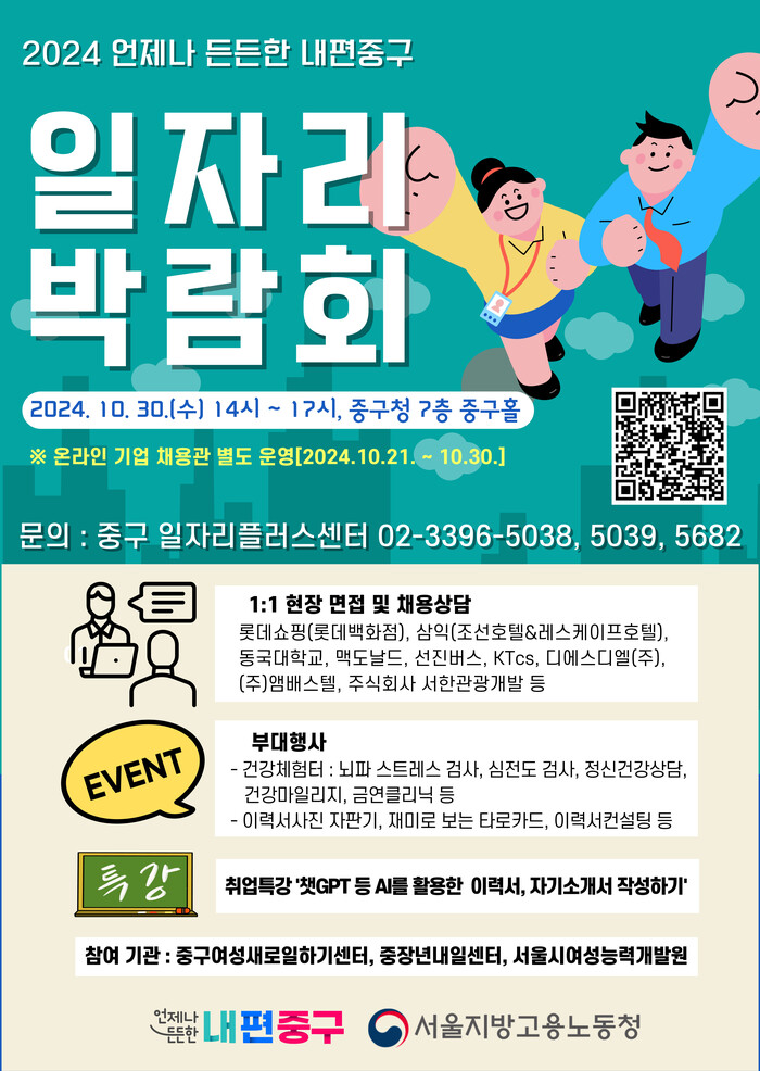 [시민일보 = 여영준 기자] 서울 중구가 오는 30일 오후 2~5시 구청 중구홀에서 ‘2024 중구 일자리 박람회’를 개최한다.