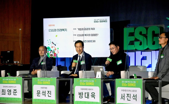 | ▲ ‘ESG(환경·사회·지배구조)와 미래복지’를 주제로 한 복지 이슈 포럼에서 문석진 구청장(왼쪽 두 번째) 등 패널들이 토론하고 있다. (사진제공=서대문구청) |