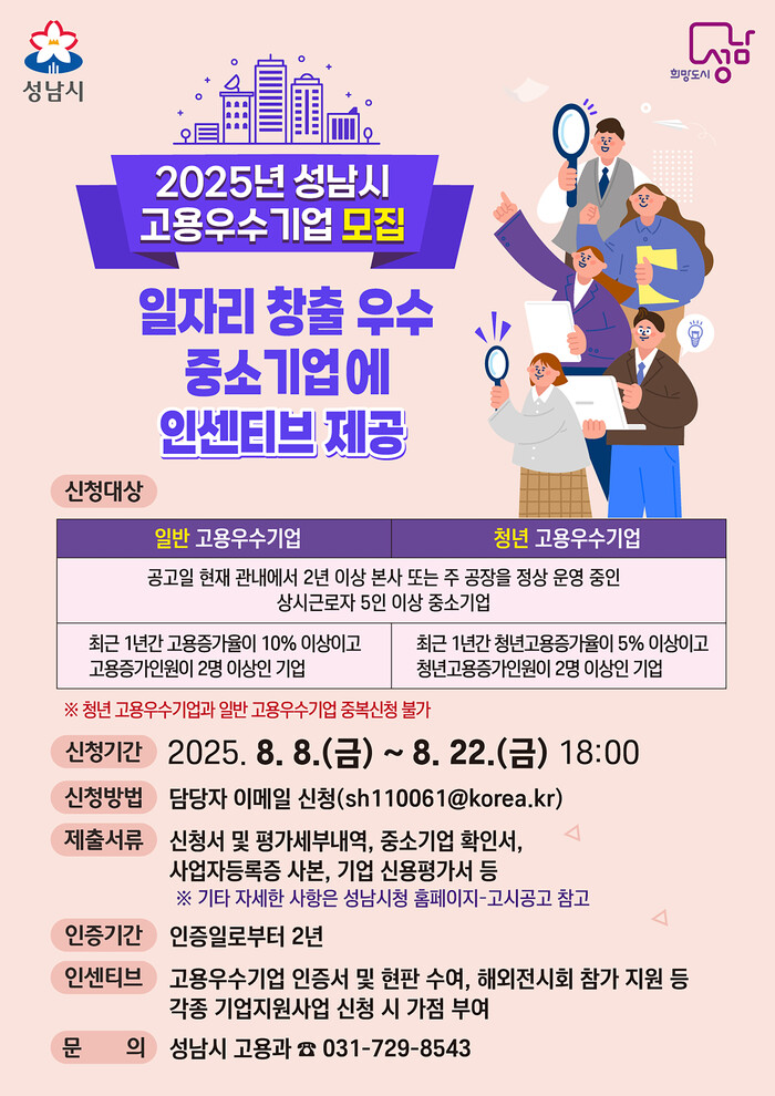 [성남=오왕석 기자] 성남시(시장 신상진)는 오는 8월 8일부터 22일까지 지역 내 일자리 창출에 기여한 중소기업을 대상으로 ‘2025년 고용우수기업’을 모집한다.