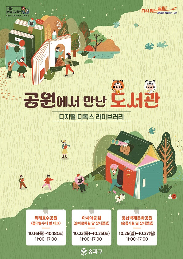 이어, 25일 오전 11시부터는 ▲아시아공원에서 ‘사일런트 책멍 in SONGPA’가 열린다. 디지털 기기를 끄고 독서에 몰입하는 프로그램으로 집중 독서키트를 활용해 특별한 독서 경험을 제공할 예정이다. 특별 프로그램 참가 신청은 송파구통합도서관 홈페이지에서 가능하다.