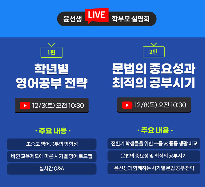 윤선생에 따르면 초등 및 중등 학부모 대상의 이번 설명회는 윤선생 유튜브 공식 채널에서 실시간 방송된다.