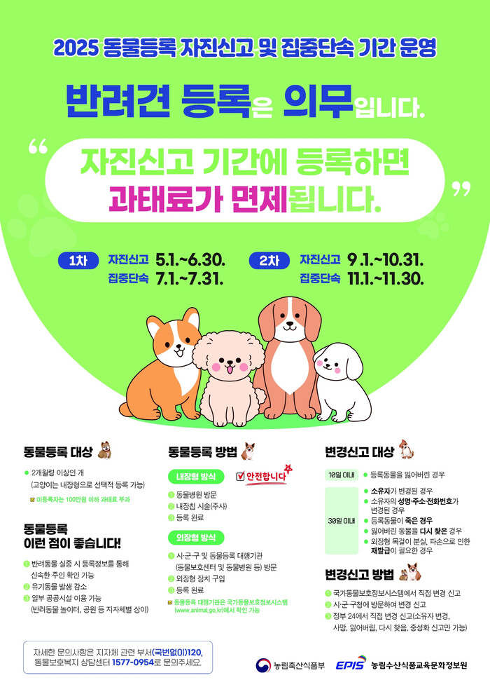 자진신고 기간 이후에는 집중단속이 진행될 예정이다. 1차 단속은 오는 7월1~31일, 2차 단속은 11월1~30일로, 이 기간에는 등록대상 동물 미등록자 및 등록정보 변경 신고 미이행자에게는 관련 법에 따라 최대 100만원의 과태료가 부과될 수 있다.