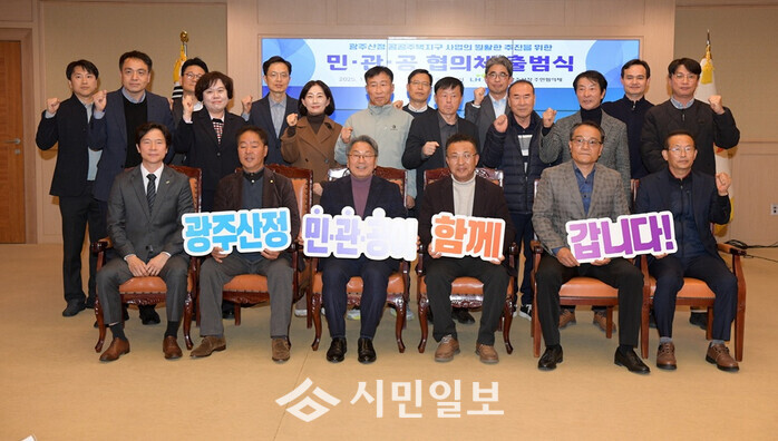 | ▲ 강기정 광주광역시장(앞줄 왼 쪽부터 세 번째)이 18일 오후 시청 비즈니스룸에서 열린 광주산정 공공주택지구사업의 원활한 추진을 위한 민·관·공 협의체 출범식에 참석하여 인사말을 한 후 참석자들과 함께 기념촬영을 하고 있다. /광주광역시 제공 |