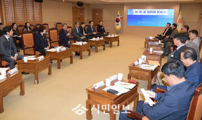 | ▲ 강기정 광주광역시장(왼 쪽부터 세 번째)이 18일 오후 시청 비즈니스룸에서 열린 광주산정 공공주택지구사업의 원활한 추진을 위한 민·관·공 협의체 출범식에 참석하여 인사말을 하고 있다. /광주광역시 제공 |