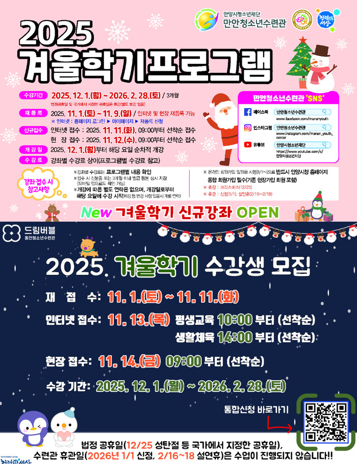 만안청소년수련관은 12월 1일부터 2026년 2월 28일까지 겨울학기 프로그램을 운영하며, 이번 학기에는 총 124개 강좌 225개 반이 개설되어 배드민턴, 탁구 등 체육활동부터 역사·과학·영어·요리·피아노 등 다양한 분야의 교육 콘텐츠를 제공한다.