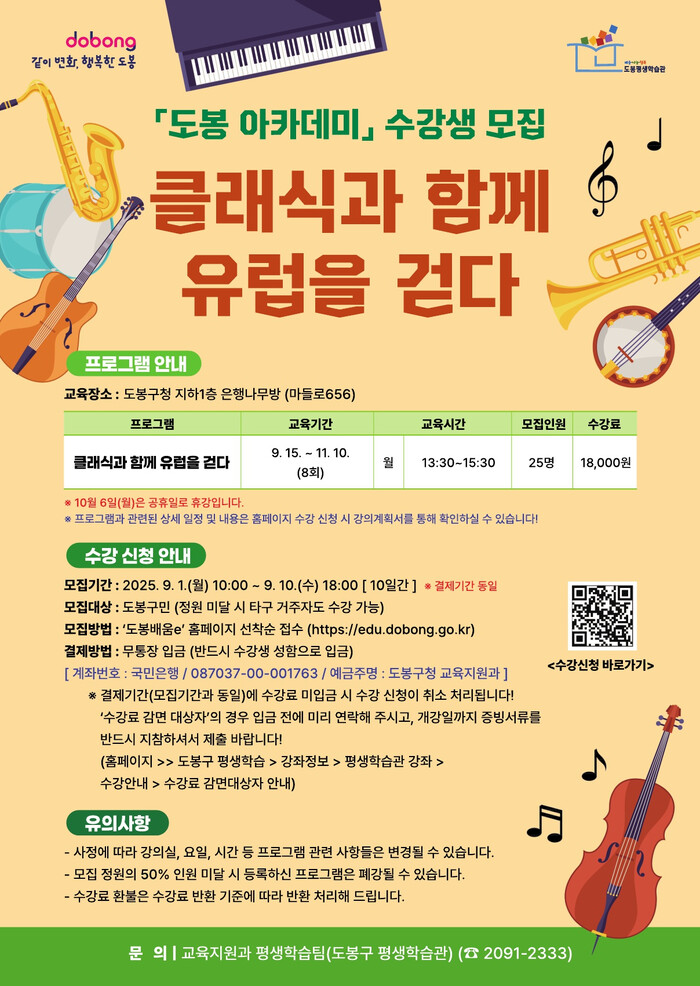 오언석 구청장은 “음악과 여행, 문화가 어우러진 강좌에 도봉구민 여러분을 초대한다. 많은 관심 부탁드린다”라고 말했다.