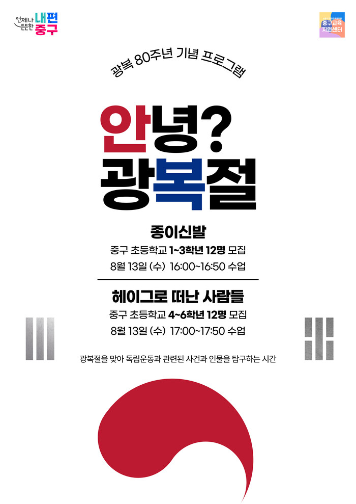 [시민일보 = 여영준 기자] 서울 중구가 광복 80주년을 맞아 어린이들이 광복절의 역사적 의미를 배우고 체험할 수 있는 프로그램을 마련했다.