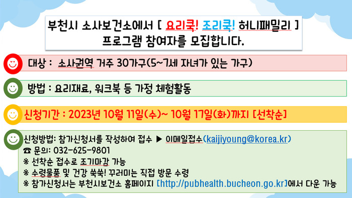 ‘요리쿡! 조리쿡! 허니패밀리’ 운영 관련 세부 사항은 부천시보건소 홈페이지에서 확인 가능하다.