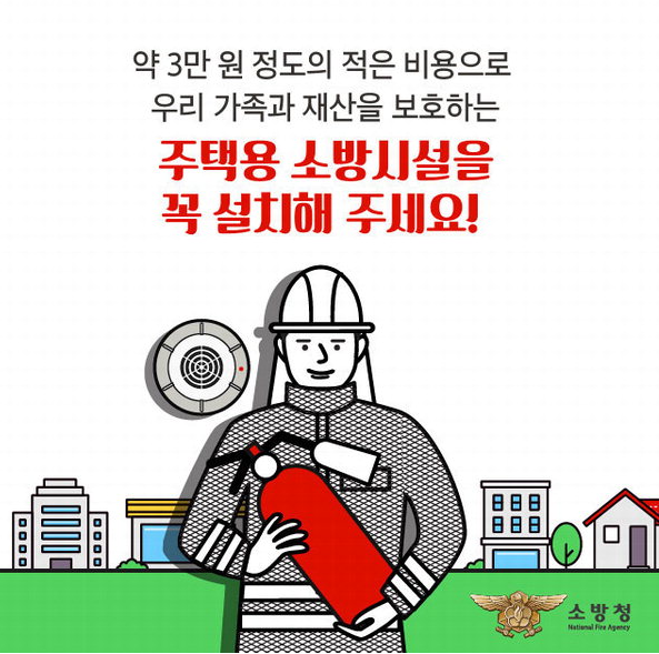 설치 대상은 단독주택(단독·다중·다가구)과 공동주택(연립·다세대)이다. 소화기는 세대·층별 1개 이상 비치해야 하고 단독경보형 감지기는 구획된 실마다 1개 이상 설치해야 한다.
