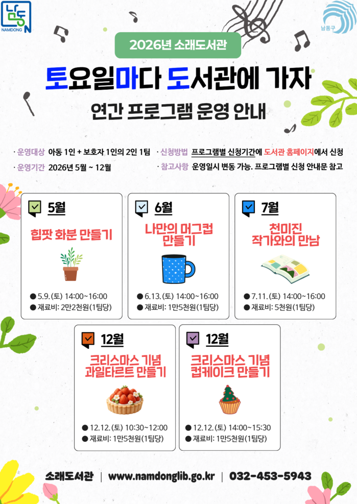 [인천=문찬식 기자] 인천 남동구 소래도서관은 5월부터 12월까지‘2026년 토요일마다 도서관에 가자’행사를 개최한다고 밝혔다.