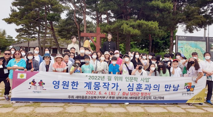 새마을문고 성북구지부는 최근 서울 성북구 초·중·고·대학생 및 학부모 등과 충남 당진에서 ‘2022년 길 위의 인문학’ 행사를 진행했다. 사진은 참가자들은 소설가이자 시인인 심훈의 생가와 당진시의 역사·문화 유적지를 탐방하고 기념촬영을 하고 있는 모습. (사진제공=성북구청)