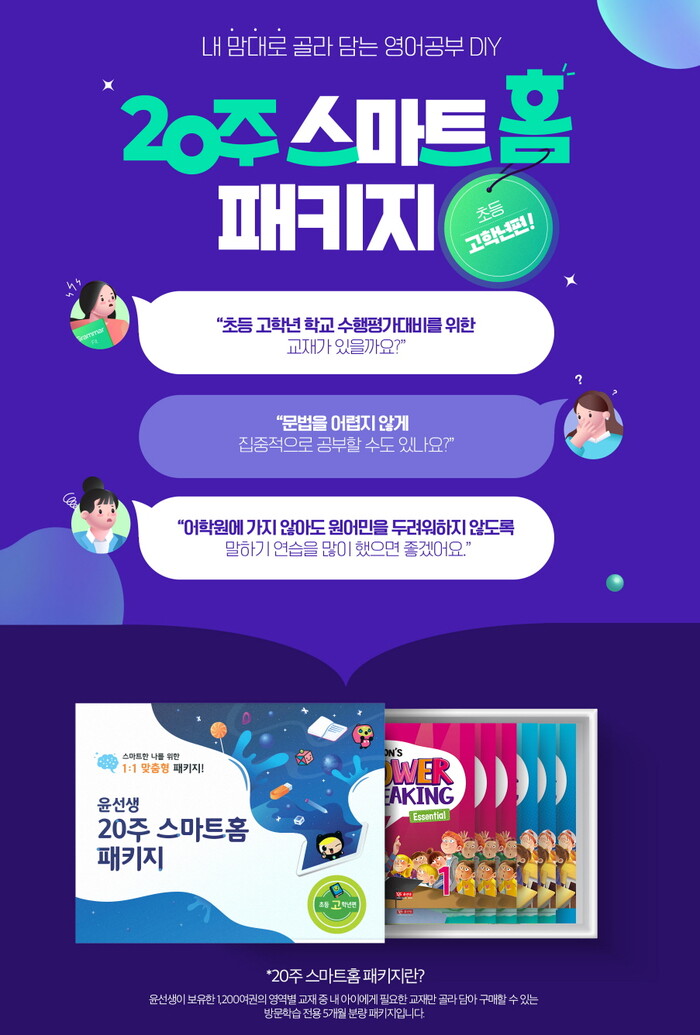 윤선생에 따르면 20주 스마트홈 패키지는 자사 방문학습 브랜드 ‘윤선생영어교실’ 전용 상품으로, 윤선생이 보유한 1200여권의 영역별 교재 중 자녀에게 필요한 교재만 골라 학습할 수 있는 DIY 영어학습 상품이다.