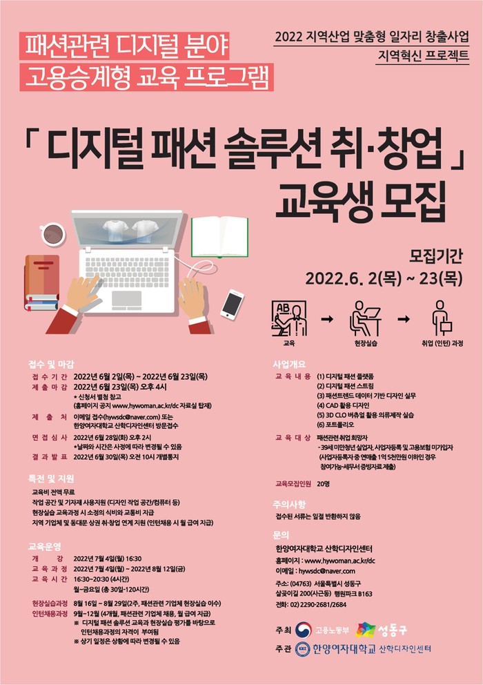 | ▲ 패션 관련 디지털 분야 고용승계형 지원 교육 프로그램 '디지털 패션 솔루션 취·창업' 교육생 모집 안내문. (사진제공=성동구청) |