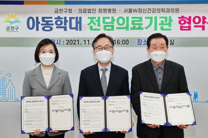 [시민일보 = 여영준 기자] 서울 금천구(구청장 유성훈)는 최근 학대 피해아동에 대한 신속한 의료지원 체계를 구축하기 위해 의료법인 희명병원, 서울W정신건강의학과의원과 아동학대 전담의료기관 지정 협약을 체결했다고 24일 밝혔다.