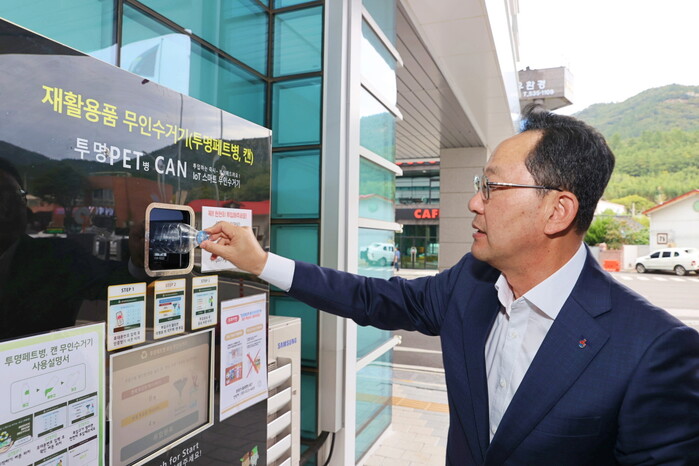 | ▲ 명현관 해남군수가 해남형 ESG 자원순환사업을 위해 해남군청 입구에 설치한 재황용품 프라스틱 수거함에 패트병을 처리하고 있다. / 자료사진= 해남군 제공 |