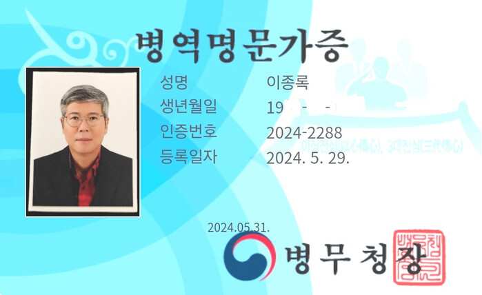이종록(남/62세)의 1대인 부친 이수영씨는 6.25참전해 무공훈장을 수훈한 국가유공자로 대전 현충원에 안장되어 있으며, 2대인 이종록 본인과 형제 2명 그리고 3대 자녀 3명과 조카 4명 등 1대 부터 3대까지 총11명이 모두 현역 복무를 성실히 마쳐 ‘병역명문가’로 선정됐다.