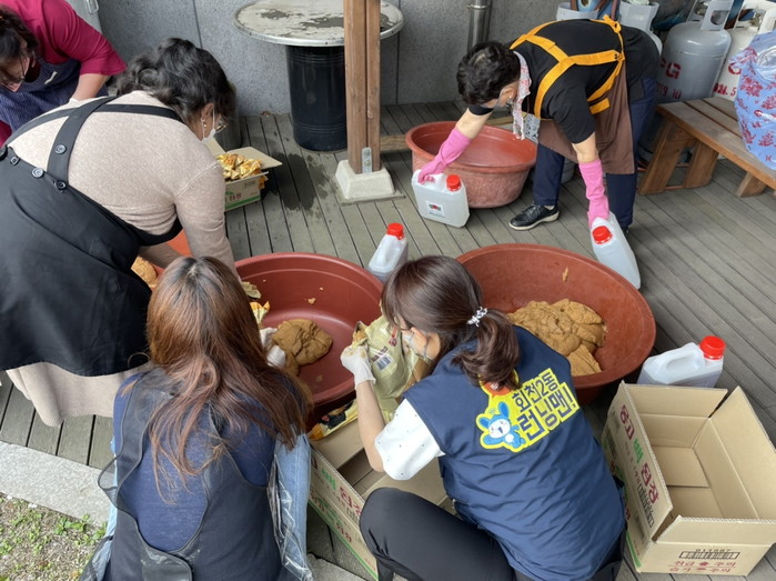 경기 양주시 회천2동 새마을부녀회는 19일 한국의 전통음식과 문화를 배울 수 있는 기회를 제공하고자 지역내 결혼이민자와 함께 사랑의 고추장 담그기 행사를 실시했다. 이날 담근 고추장은 어려운 이웃에게 전달될 예정이다. 사진은 행사에 참석한 결혼이민자와 부녀회원들이 고추장을 만들고 있는 모습. (사진제공=양주시청)