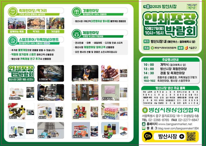 특히 스탬프 투어형 전시·홍보 부스에는 14개 점포가 참여해 방문객을 맞이한다. 방문객은 점포를 방문해 PE·PP 케이스, 종이박스, 테이프, 비닐포장지, 벽지·바닥재, 인쇄 지류 등 방산시장의 대표 품목을 살펴보고 설명도 들을 수 있다.
