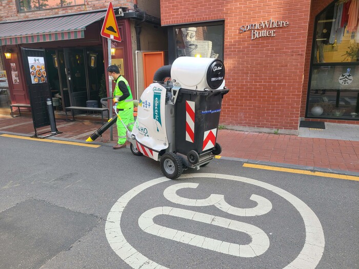 성동구 성수동(서울숲 카페거리)에서 ‘365 청결기동대’가 친환경 도시형 거리청소기 ‘글루통’으로 도로 위 쓰레기를 수거하고 있다.