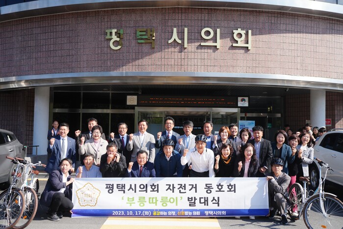 [평택=오왕석 기자] 평택시의회(의장 유승영)는 지난 17일 의회 현관에서 의원과 직원 간 소통 강화와 건강 증진을 도모하고자 자전거 동호회를 구성하며 발대식을 개최했다.