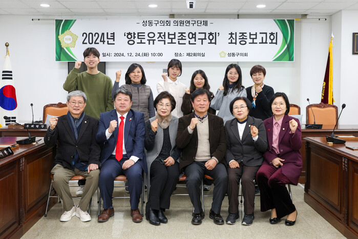 | ▲ ‘향토유적보존연구회’ 최종보고회에서 남연희 의장(앞줄 왼쪽 세 번째)과 연구회 관계자들이 기념 촬영을 하고 있다. (사진=성동구의회 제공) |