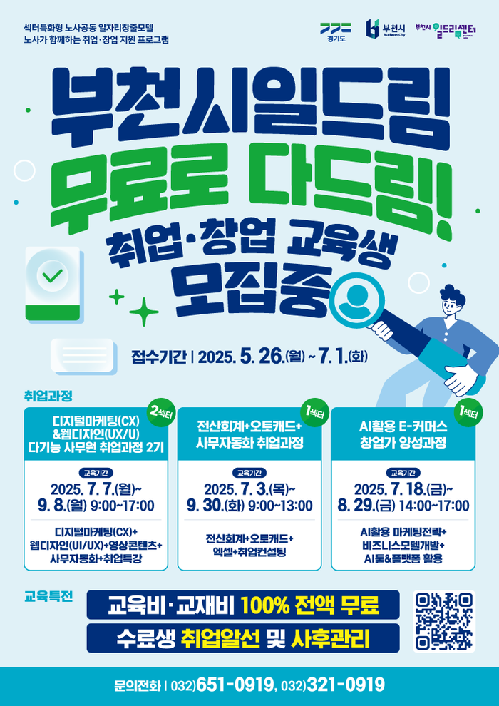 [부천=문찬식 기자] 경기 부천시는 부천시일드림센터가 오는 7월부터 9월까지 취ㆍ창업 교육과정 3개를 운영하며, 교육생을 모집한다고 26일 밝혔다.