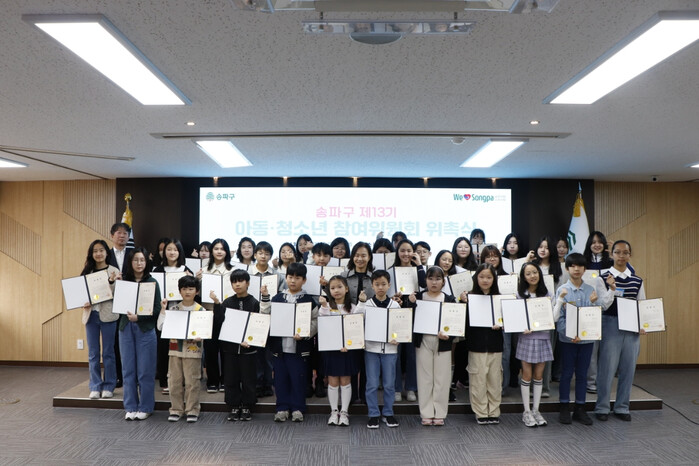 올해 13기를 맞은 ‘송파구 아동·청소년참여위원회’는 아동과 청소년이 직접 정책을 제안하고 구정에 참여할 수 있는 기구로, 구는 최근 위촉식을 열고 아동·청소년 총 40명을 참여위원으로 위촉했다고 16일 밝혔다.