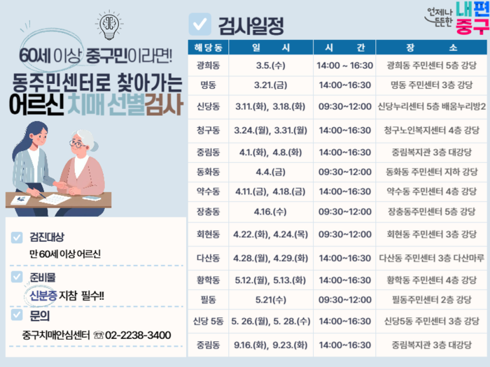 '찾아가는 어르신 치매 선별검사'는 60세 이상 중구민을 대상으로 하며 인지선별검사(CIST)를 활용해 1대1 문답과 지필 방식으로 진행된다. 전반적인 인지 기능을 평가하고 인지 저하 여부를 선별하는 데 약 15~20분이 소요된다.