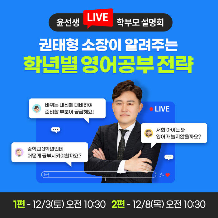 윤선생에 따르면 이번 설명회는 1편과 2편으로 편성된다. 1편에서는 권태형 교집합 교육연구소장이 ‘학년별 영어공부 전략’을 주제로 강연한다. 이번 방송에서는 바뀐 교육제도를 적용한 시기별 영어 로드맵과 초·중·고 영어공부의 방향성을 이끌어주는 시간이 마련된다.