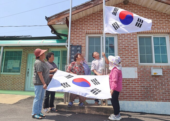 | ▲ 황산면 산소리 주민들이 마을회관 국기 게양대에 제78회 8.15광복절 맞이 태극기 게양 / 해남군 제공 |