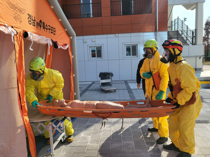 [창원=김점영 기자] 경남도 소방본부가 최근 경남소방본부 119특수대응단에서 유해화학물질 누출사고에 대비한 권역별 합동훈련을 진행했다고 밝혔다.
