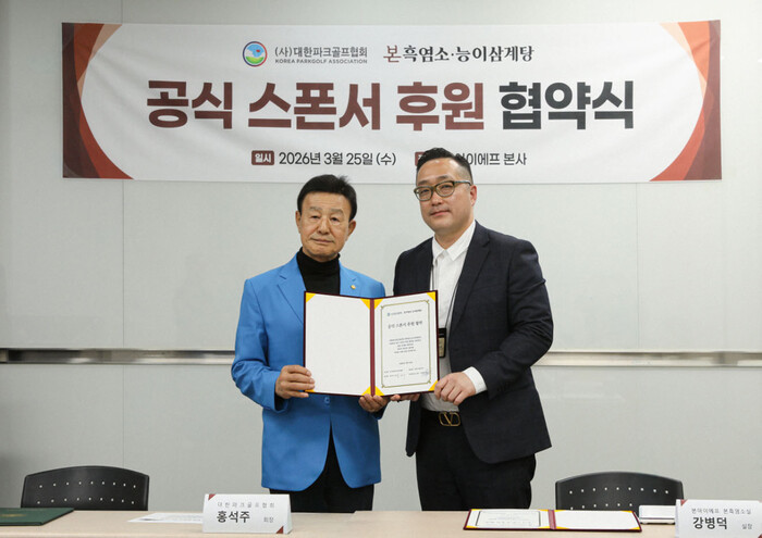 지난 25일 진행된 협약식에는 대한파크골프협회 홍석주 회장과 본흑염소능이삼계탕 강병덕 실장이 참석해 파크골프 스포츠 발전과 건강 증진을 위한 상호 협력을 약속했다.