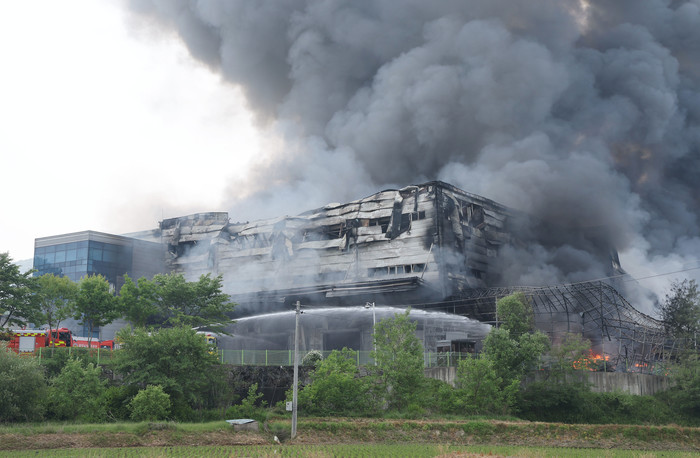 23일 화재가 발생한 경기도 이천시의 한 물류창고에서 소방관들이 진화작업을 하고 있다.