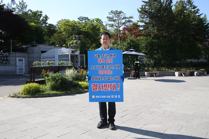 [시민일보 = 이대우 기자] 정재호 서울 종로구의회 행정문화위원장은 최근 삼청동 총리공관 앞에서 대통령 인수위원회의 ‘청와대로 차 없는 거리’ 시행을 반대하는 1인 시위를 펼쳤다.