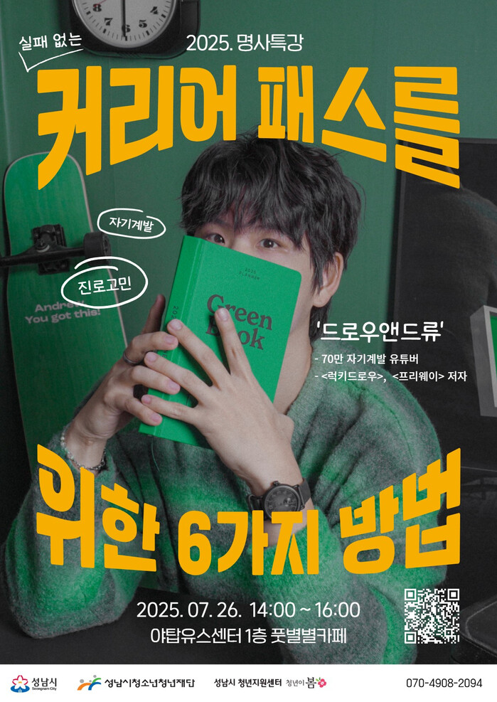 특강은 유튜브 구독자 70만 명을 보유한 인기 크리에이터이자 ‘럭키드로우’, ‘프리웨이’의 저자인 ‘드로우앤드류’가 맡는다. ‘실패없는 커리어 패스를 위한 6가지 방법'이라는 주제로 현실과 이상 사이에서 진로를 고민하는 청년들에게 공감과 진로 동기부여의 시간을 제공할 예정이다.
