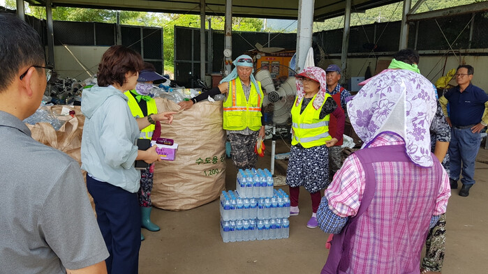 [인천=문찬식 기자] 인천 강화군 화도면(면장 조순이)이 지난 21일, 사기리 재활용 선별장에서 무더운 날씨 속 현장에서 근무하고 있는 선별장 근로자들을 응원하는 시간을 가졌다.