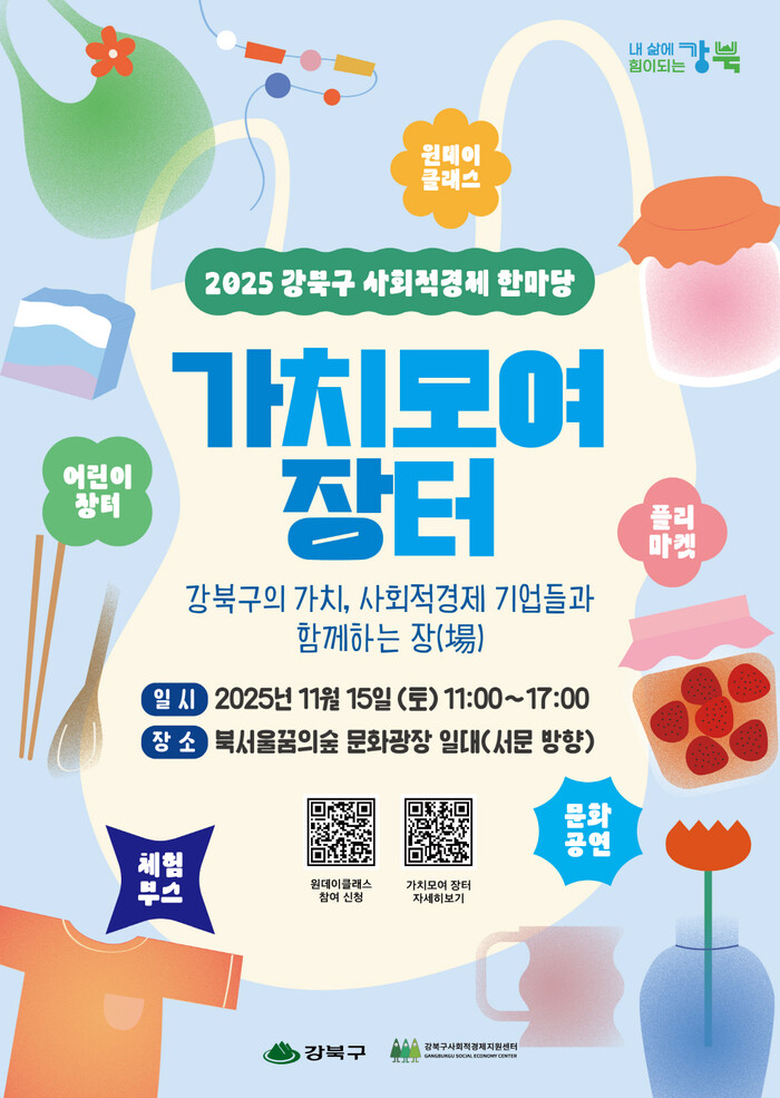 [시민일보 = 문민호 기자] 강북구(구청장 이순희)는 오는 15일 북서울꿈의숲 문화광장(월계로 173, 서문방향)에서 2025 강북구 사회적경제 한마당 ‘가치모여 장터’를 개최한다.