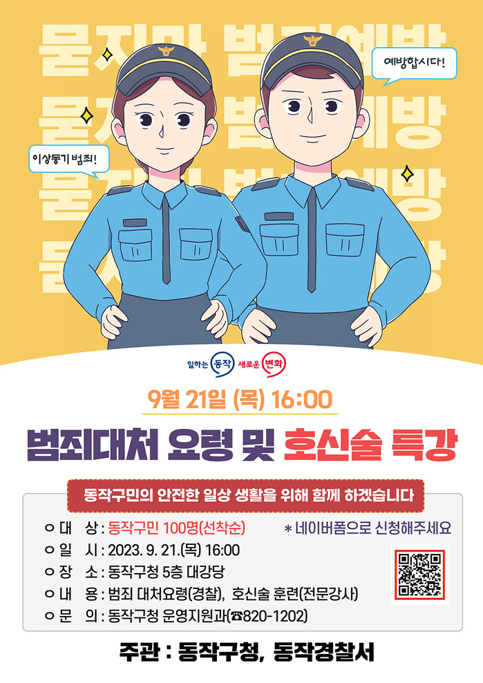 이날 교육은 오후 4시 구청 대강당에서 진행되며 동작경찰서 경찰관이 실제 범죄 대응 사례, 112 신고요령 등 범죄대처 요령을 중점적으로 강의할 예정이다.
