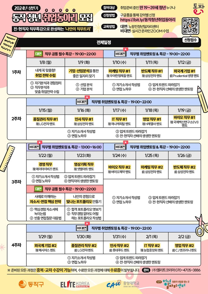 관내 거주 또는 활동하는 만 19~39세 구직 청년이라면 누구나 신청할 수 있다. 강좌별 전날까지 신청 가능하며, 신청방법 및 자세한 사항은노량진청년일자리센터를 통해 문의하면 된다.