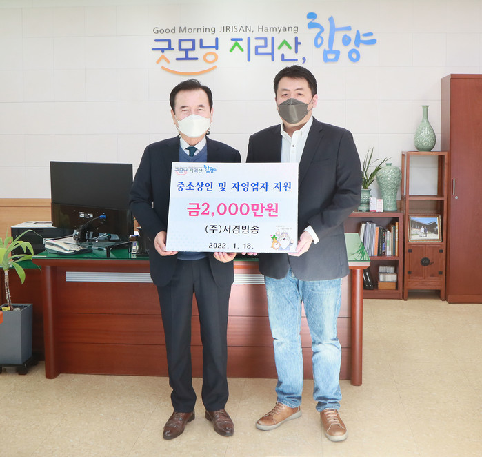 함양군은 1월 18일 오전 서부경남 대표 케이블방송인 서경방송(회장 윤철지)에서 코로나19 장기화로 지친 함양지역 중소상인과 자영업자를 지원하기 위해 성금 2,000만원을 기탁했다고 밝혔다.