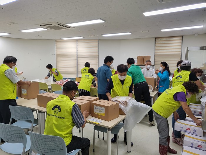 경기 양평군 용문면지역사회보장협의체가 지난 5일 추석을 맞이해 지역내 저소득 취약계층 150가구를 위한 소고기·백미·떡 등으로 구성된 행복꾸러미를 전달했다. 사진은 이날 협의체 위원들이 행복꾸러미를 포장하고 있는 모습. (사진제공=양평군청)