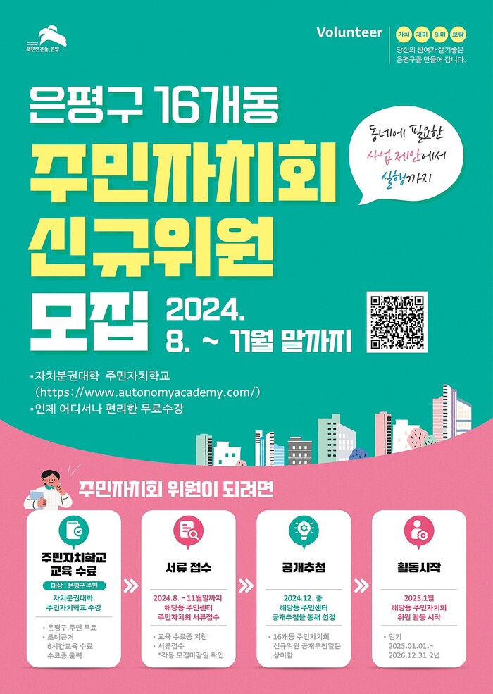 [시민일보 = 이대우 기자] 서울 은평구(구청장 김미경)는 2025년 새롭게 구성될 16개 동 주민자치회 신규위원 모집을 이달부터 시작하고 ‘자치분권대학’과 연계해 주민자치학교 온라인 교육을 실시한다고 밝혔다.