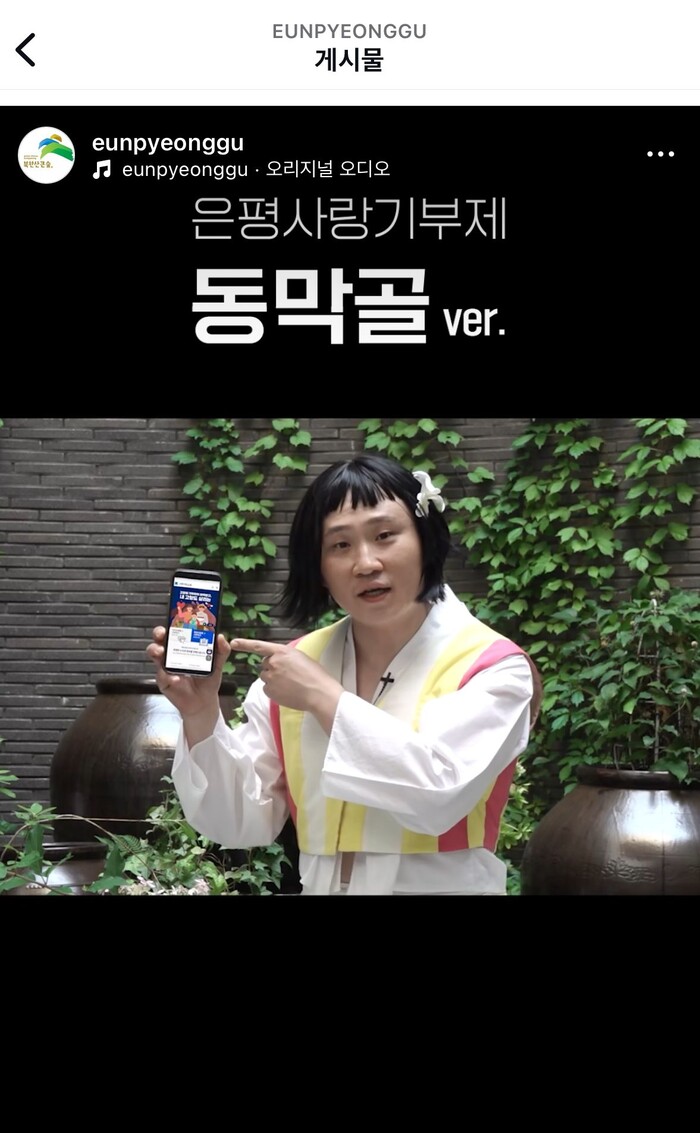 구가 공개하는 영상은 영화의 한 장면을 패러디해 고향사랑기부제 홍보용으로 각색한 내용으로 꾸며졌다. 해당 영상은 지난 1일부터 매주 월요일 오후 1시 은평구청 공식 유튜브, 인스타그램으로 업로드 예정이다.