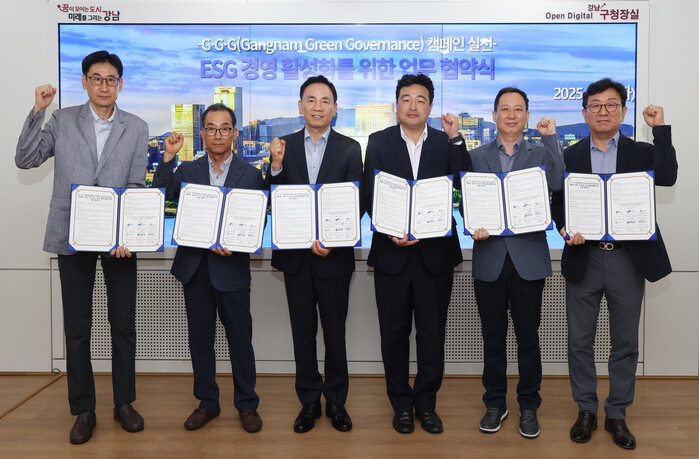 [시민일보 = 이대우 기자] 서울 강남구(구청장 조성명)가 구청에서 지역내 대형 건축공사장의 시공사 5곳과 ‘G.G.G.(Gangnam Green Governance) 실천 캠페인 및 ESG 경영 활성화를 위한 공동 협약’을 체결했다고 9일 밝혔다.