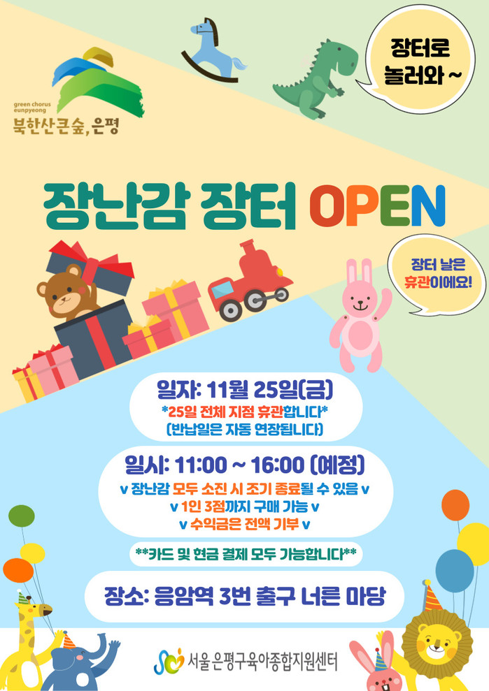 [시민일보 = 이대우 기자] 서울 은평구(구청장 김미경)가 오는 25일 오전 11시부터 응암역 3번 출구 앞 광장(은평 너른마당)서 ‘장난감 장터’를 운영한다.