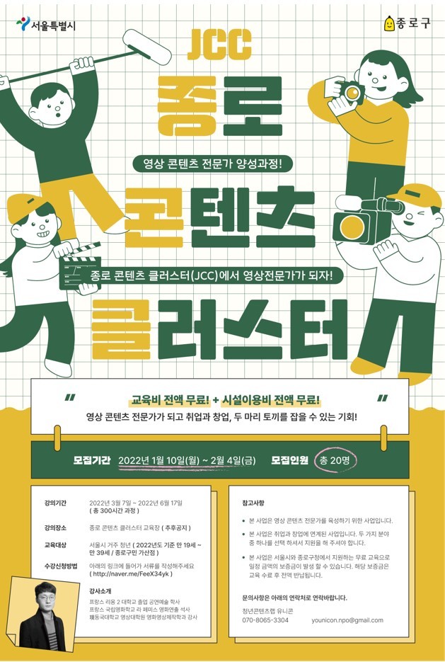 [시민일보 = 이대우 기자] 종로구가 영상 전문가 육성을 위해 서울시와 손잡고 ‘종로 콘텐츠 클러스터(JCC) 영상 콘텐츠 전문가 양성과정’을 운영한다.