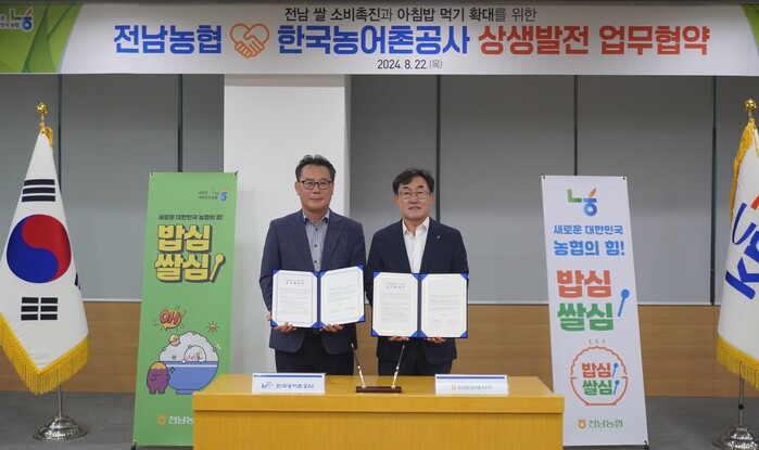 [남악=황승순 기자]농협전남본부(본부장 박종탁)는 22일 한국농어촌공사(사장 이병호) 본관에서 전남 쌀 소비촉진과 아침밥 먹기 확대를 위한 상생발전 업무협약을 체결했다.