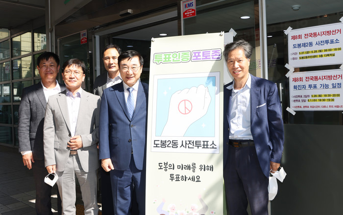 이동진 서울 도봉구청장이 지난 27일 제8회 전국동시지방선거 사전투표소에서 투표를 했다. 사진은 이 구청장(오른쪽 두 번째)이 사전투표소에서 투표를 마치고 구청 직원들과 인증사진을 촬영하고 있는 모습. (사진제공=도봉구청)